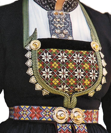 At the neck of the Hardanger bunad there is a brooch formed as a double button, preferably with pendants. The shirt has a larger gilded brooch, often with dish leaves or cross leaves - or both. Married ladies may carry a wide chain with Agnus Dei. A plaque belt is a must-have on this bunad, often with a fangreim. Light and gilded silver is used, and on the winter bunad you might find oxidized silver as well.