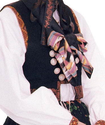 The bunad came into use at the beginning of the 19th century. It was common in Flesberg to use several stacks on top of each other, up to seven pieces. Today, only two or three layers are normally used. The bunad has changed quite a bit over the years, depending on what kind of material was available and what was fashionable at the time. Therefore, there are several variants of the Flesbergbunad. The picture shows Kongsberg's variant. Both black and dark blue are used for skirts and waist. The shirt has embroidery on the neck and cuffs, and the headdress has long, wide ribbons to tie under the chin. There are also capes and coats for the bunad.