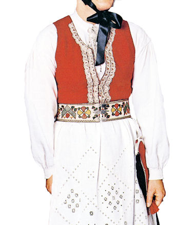 The Meldalbunad was launched in 1952 based on some preserved bunads from the 1800s. The bodice of this bunad can be in green or red and has previously been made in several different fabrics. The skirt is in blue or black wool fabric, while the apron can be in black damask or white linen. Cotton can also be used. The belt has embroidered biblical motifs and has two to three buckles at the front. The bunad has a headdress that separates married and unmarried people, as well as a purse. Both the cape and shirt are made in the same fabric as the skirt.