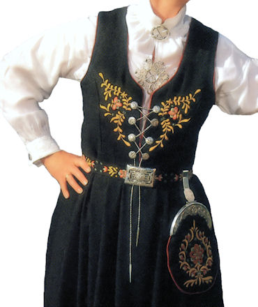 This bunad from Nedre Buskerud was launched in 1939, after a long period of work. The embroidery on the bunad was designed by Halvdan Arneberg, who was inspired by the decoration on some old furniture from Eiker. The bodice, belt, cape, loose pocket and headpiece are made of black wool fabric.