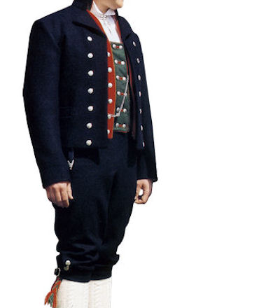 This men's bunad from Voss has a black coat and long trousers or knee breeches. The vest is red with a recessed green front. This makes it look like there are two vests on top of each other. The vest fastens with two rows of buttons on the green part. There are also two rows of buttons on the red part. The shirt is white and often has embroidery on the collar and cuffs. White stockings and colored ribbons are also included. The headdress for men is a black felt hat, while boys wear a red knitted hat. Boys also wear a simple red vest.