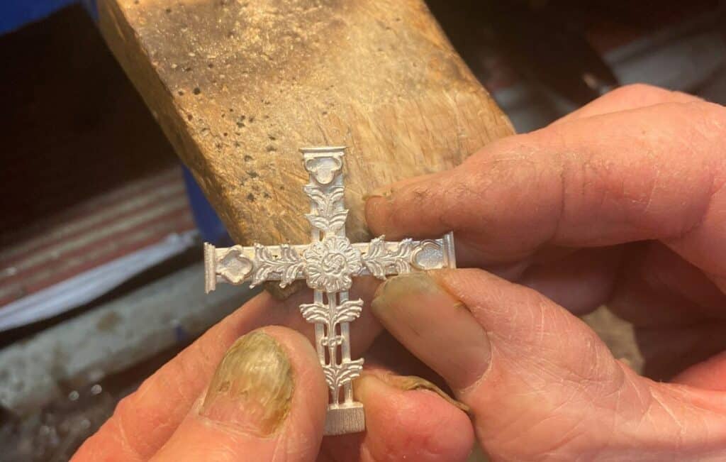 The altarpiece at Dal Church is adorned with a beautifully carved wooden rose cross, with a crucifix attached. Kolbjørn was fascinated by this rosary when he created a beautiful, solid miniature in silver. Exactly how old the rosary is is uncertain. What we can say for sure, however, is that the cross and the attached crucifix probably did not originally belong together. The crucifix probably coincided with the arrival of Catholicism in medieval Norway, and is dated to the period between 1250-1260. This dates the rosary itself to pre-Catholic or early Catholic times. The design of the rose cross itself, with carved leaves and foliage, is not a particularly Norwegian decoration, and there are several crosses with similar decorations to be found abroad. The decoration is inspired by a kind of “tree of life” symbolism and is suitable without a figure.