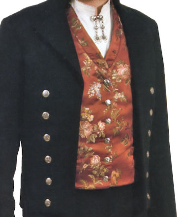 The men's bunads from Gudbrandsdalen are made in several versions. The bunads that went into production in 1962 have three variations of jackets. A black or white half-length coat and a black shorter coat. A detailed reconstruction from the early 1800s exists as well. There are also two types of vests, single-breasted (one row of buttons) and double-breasted (two rows of buttons). Both short and long trousers are worn with the bunad.