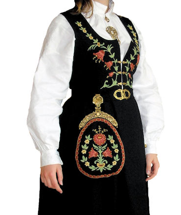The bunad was developed by Østfold Women Farmer Association (Bondekvinnelag) and went into production in 1949. The bunad is made in blue or black fabric and has wool embroidery on the front and back. The embroidery for the bunad was designed by Halvdan Arnesen. The shirt is in white linen and has embroidered motifs on the collar, chest and cuffs. The hat and purse are made from the same fabric as the bodice and skirt, and have beautiful embroidery. Both a cape and a coat are made for the bunad.