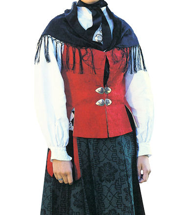 The bunad from Namdalen was created by Kaja Severeide in the 1950s. The special thing with this Bunad is the traditional block print on the green woolen skirt. The waist piece is made in a damask-like red fabric, and the shirt is white embroidered linen. The pockets are made of the same fabric as the waist-piece, with inlaid black velvet. A headdress, neckerchief and cape belongs with this bunad as well. The Namdalsbunad has its own bunad silver, based on Woxeng's collections in Vikna.