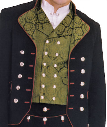 The bunad from Rogaland was launched in the early 1920s. It is based on garments from the early 1800s. Several variations of the bunad are made depending on the supplier. Breeches are most common, but long trousers are also used. The coat is distinctive because of the pattern on the lapels that is repeated on the vest, lower collar and pocket covers.
