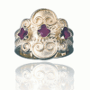 This is a ring with a slightly chunky, decorative filigree section with 3 small bowls that hang loosely.