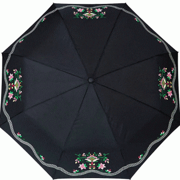This black umbrella has a pattern that matches the Lundeby bunad, the umbrella can be fully folded and comes with a pull.