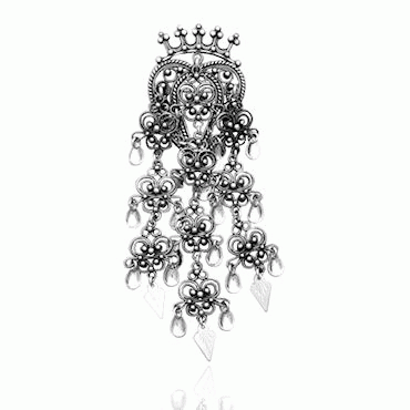 This brooch has 10 filigree pendants with drip leaves on the heart base.
