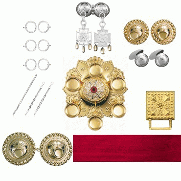 This complete package proposal includes neck pin no. 15 light gold-plated, googly eye no. 8, bangle no. 32 light, drill no. 1 medium gold-plated, 3 pairs of paint rings light and paint spoon no. 8 light 1 meter, as well as a red, 4 cm wide leather belt with belt buckles no. 2 and bag tag no. 16.