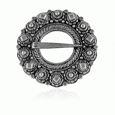 These rings are often called neck rings because they are used to hold the neck collar together. However, silversmiths often refer to them as ripple rings because they consist of "ripples" arranged in a circle. But halssølje, sprode, sprette or other local names are seen all over the place. These often function as a neck pin. They are more interesting than they look, because practically all brooches are in some way built up around such simple circles with a needle across them. Others are just much more ornate. And even in that simple form, there's a lot of symbolic meaning. So ripples, neck rings, are valuable pieces of bunad silver.