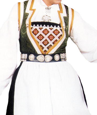Traditionally, Os and Fusa are considered to be the same bunad area, where the Hardanger bunad was used as a festive bunad for a long period. It is still in use in Os, but a new bunad was made in the 1950s on the basis of preserved costume material from the late 1800s. It is made in several variations with combinations of fabric and ribbon. The waist piece for the married is in green fabric, while the unmarried use red. The skirt itself is black with a red underskirt. The apron and shirt are in white linen or rough cotton or canvas fabric. The chest cloth and belt can have pearls, wool embroidery, or a combination. The belt is fastened with a buckle, but married women can also wear a silver belt.