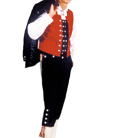 The men's bunad from Os is a variation of the popular bunad from around the 1900s. The coat and breeches are in black wadmal. The vest is made of red cloth with a green field in the middle of the front. This gives the illusion of two vests, emphasized by the use of a double row of buttons on the green field and a single row of buttons on each side of the red vest. The shirt is in white cotton canvas or linen.