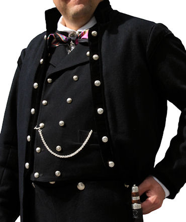 The initiative to create this bunad came from the "leikaring" in Krødsherad in the 1970s. They first copied both the vest and knee breeches. The shirt and long trousers came somewhat later. Different tailors have their own variations on the bunad, whether it's the stitching or the number of buttons. Always check with your tailor about the number of buttons. Work continues on reconstructing older costumes.