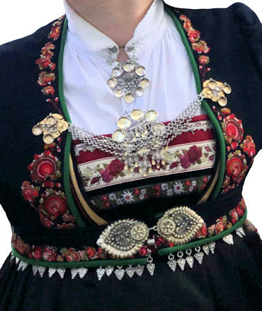 The Skjælestakk was used in Tinn in the first half of the 19th century and is older than the Tinnbunad. On the Skjælestakk we see even more clearly than on the Tinnbunaden the similarities with Hallingdal and Numedal both in colors, stitching and silver. The majority of the silver can be found again later on Tinnbunaden. For example, the dish-brooch. Incidentally, the dish-brooch and rose-brooch are brooch models that originated back in the 14th century. The neck buttons and arm buttons (cufflinks) are also of the same types as for the Tinnbunad. On the other hand, the plaque belt, eyelets and cape-chain are all Skjælestakk silver, and almost never to be found on the Tinnbunad. The Skjælestakk uses more brass than the Tinnbunad.